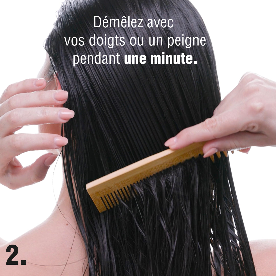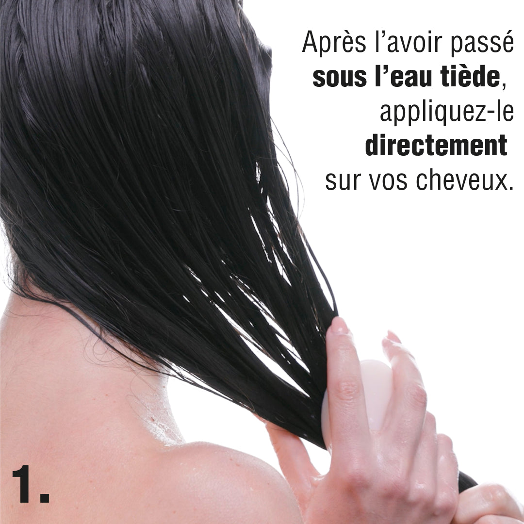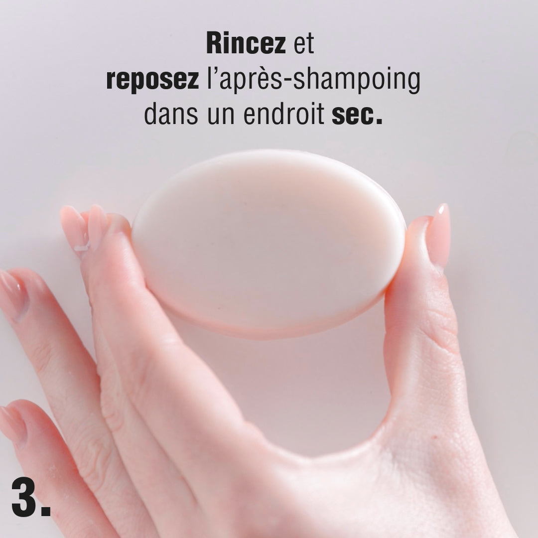 Tout comme une formule liquide, notre après-shampoing solide ne mousse pas : une fois humidifié, appliquez-le des longueurs jusqu’aux pointes jusqu’à ce qu’un lait se crée. Ensuite, démêlez vos cheveux et les résultats seront au rendez-vous !