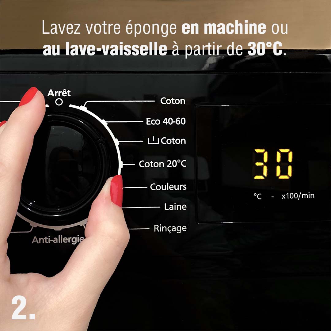 L’idéal est de passer votre éponge lavable en machine à laver à 30°C ou à 40°C. De façon très ponctuelle, vous pouvez laver votre éponge la marque en moins à 60°C, afin de la nettoyer en profondeur. Attention toutefois à ne pas multiplier les lavages à cette température pour éviter que le tissu de votre éponge ne se dégrade.