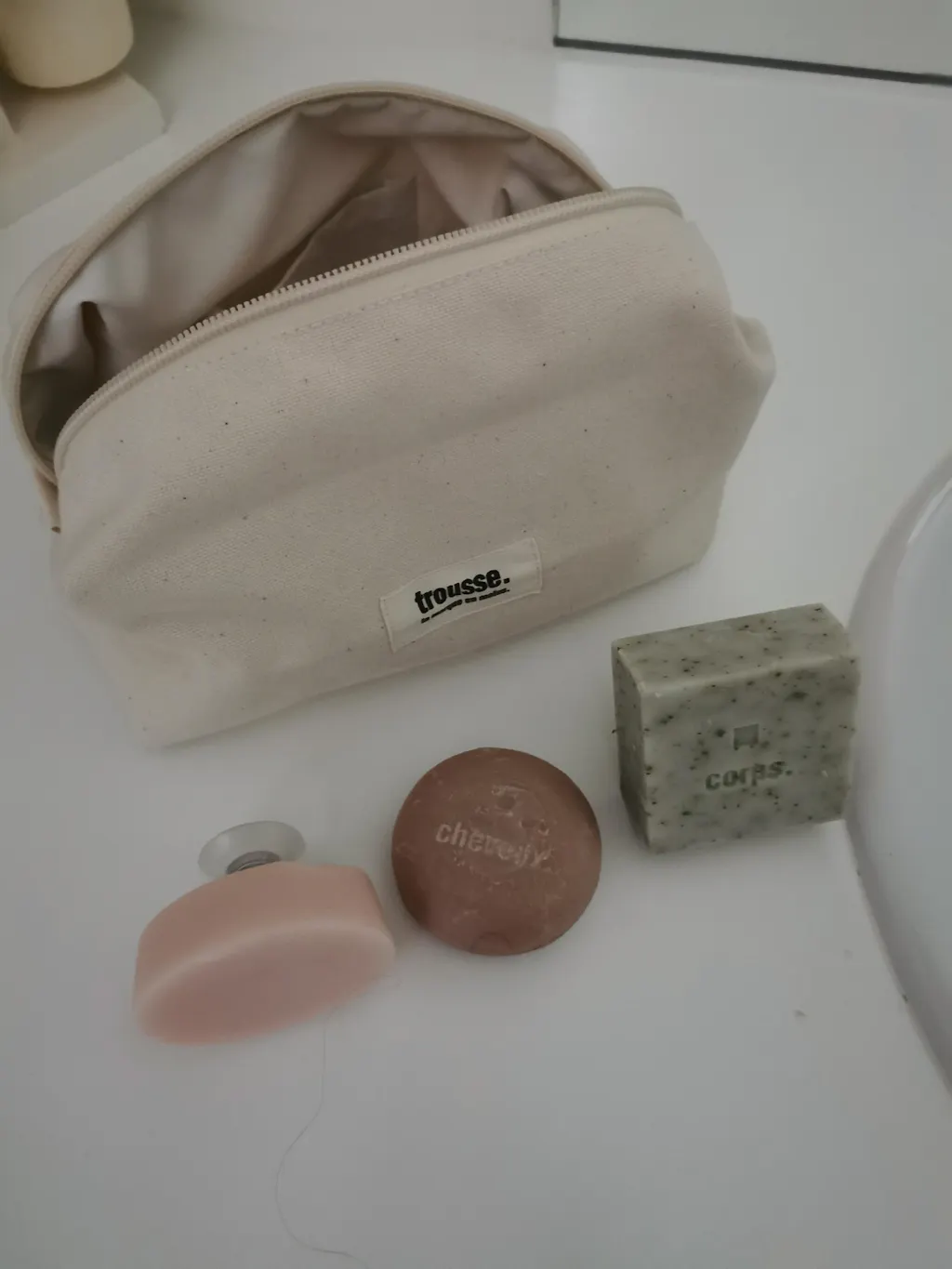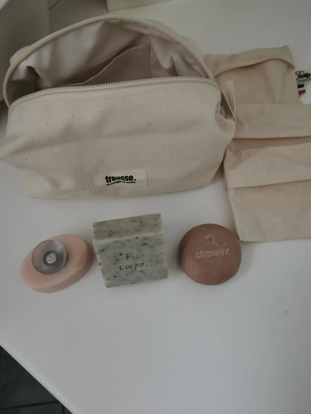 Je n’ai essayé que le shampoing pour le moment avec son porte-savon: topissime! Mes cheveux sont doux et énergiques, ce qui n’est que rarement le cas avec des shampoings solides. La trousse est de bonne qualité, solide et esthétique.